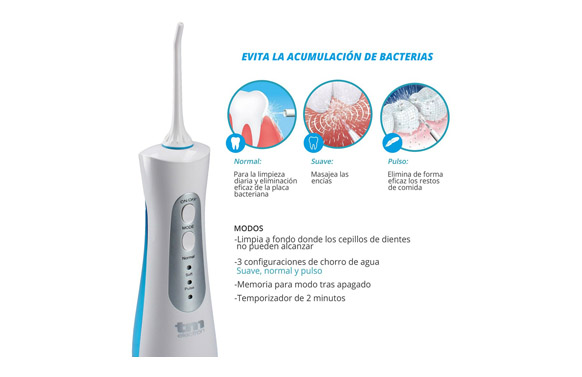 Irrigador bucal con diseño portátil y batería recargable TM ELectron.. - Batería de litio de 1400mAh de capacidad.. - Recarga la batería en cualquier puerto USB.. - Potente bomba con una potencia de 5W impulsa el agua a presión por el circuito.. - 3 modos de funcionamiento: Suave, Normal o Pulso.. - Diseño ergonómico y 2 boquillas.. - Tanque de llenado de 150ml de capacidad.. - Sistema de sellado. Impide las fugas de agua mientras el aparato se encuentra funcionando o en reposo.. - Grado de protección IPX7 que le confiere protección total contra los efectos del agua.. - Temporizador de 2 minutos y memoria de modo. El irrigador se apaga automáticamente a los 2 minutos que es el tiempo de uso recomendado.. - Su memoria de modo permite que la limpieza empiece en el último modo en que se usó.